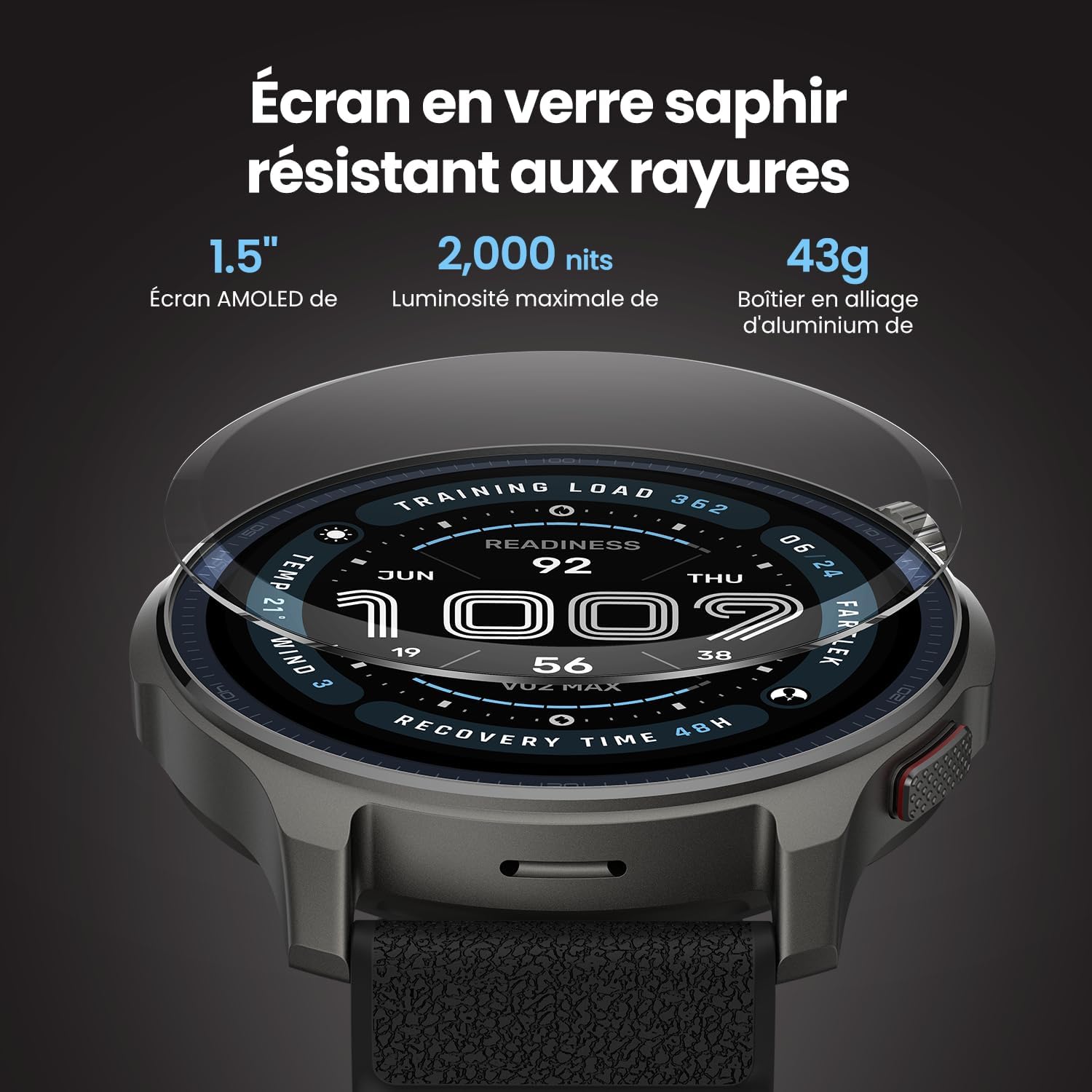 L’รฉcran est un AMOLED de 1,5 pouce avec une rรฉsolution de 454 x 454 pixels, protรฉgรฉ par un verre saphir, assurant une forte rรฉsistance aux rayures et une excellente luminositรฉ mรชme en plein soleil.