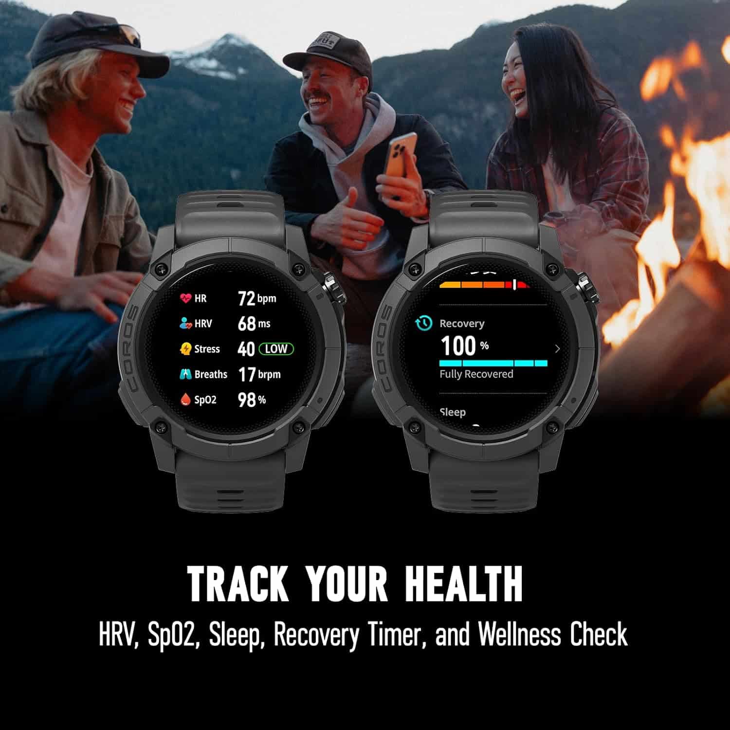 La COROS Nomad Gris foncé intègre un suivi de la fréquence cardiaque, la saturation en oxygène (SpO2), la température corporelle, un altimètre barométrique, un capteur de luminosité, ainsi que les fonctions de suivi du stress, respiration guidée, analyse du sommeil et alertes sur rythme cardiaque anormal.