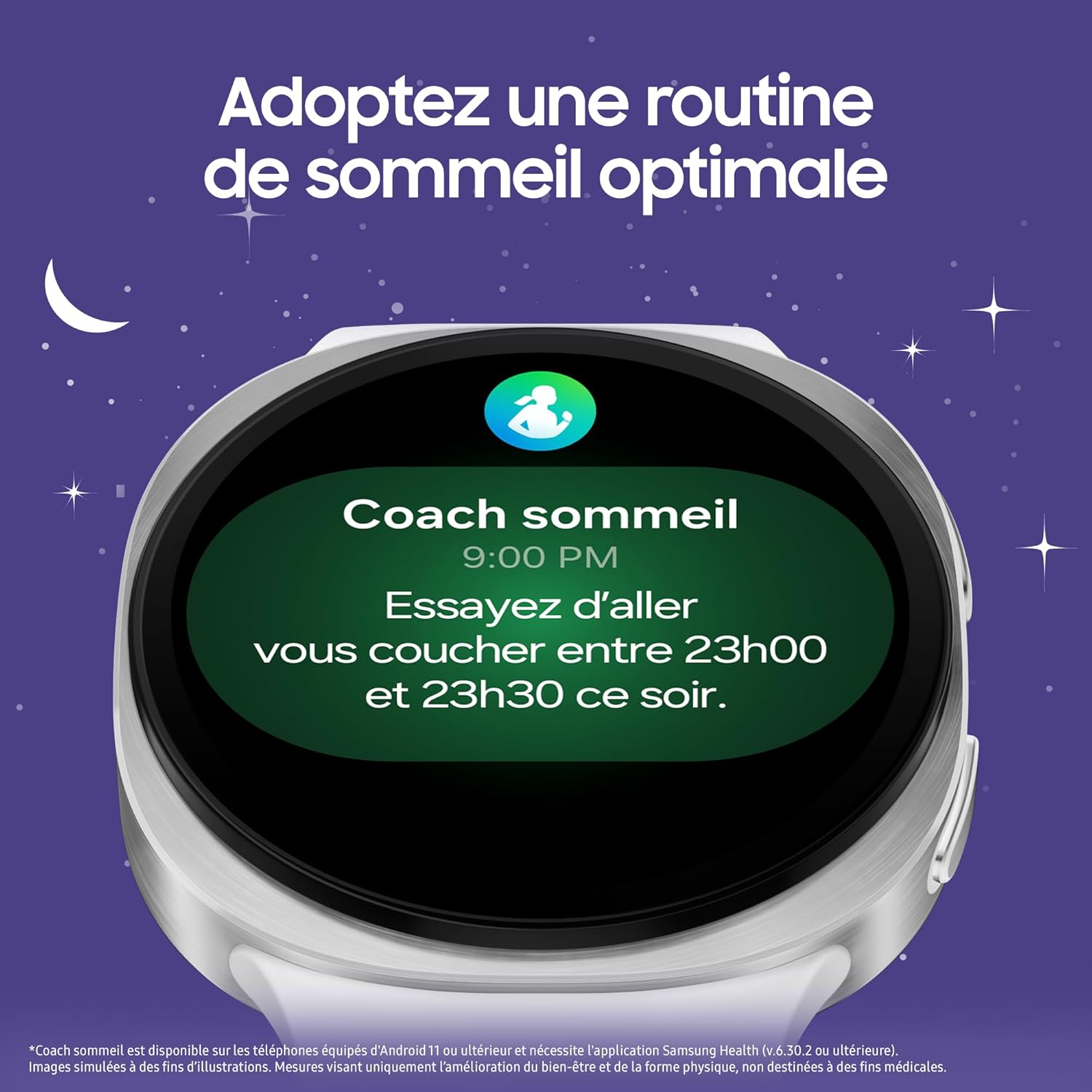 Le Coach Sommeil intรฉgrรฉ ร la Samsung Galaxy Watch8 40mm Argent analyse automatiquement vos cycles de sommeil grรขce ร la fonction d’analyse du sommeil. Cette fonctionnalitรฉ utilise les capteurs de mouvement et de frรฉquence cardiaque pour รฉvaluer la qualitรฉ de votre repos, identifier les phases de sommeil lรฉger et profond, et vous fournir des recommandations personnalisรฉes pour amรฉliorer votre sommeil. Les donnรฉes sont synchronisรฉes avec l’application Samsung Health pour un suivi longitudinal.